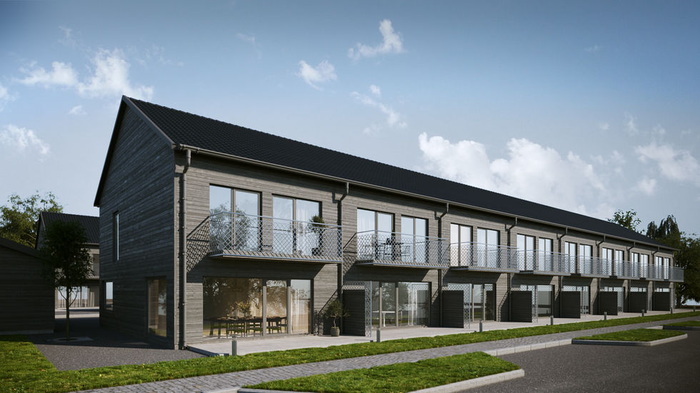 This new wooden construction 19 unit rowhouse project is located on Bollgränd Street in Nyköping, Sweden, right by the sea. The two-story units are constructed with high-quality wood and feature large windows. Each unit is designed to maximize space and natural light. The exterior of the rowhouse project is painted in a light gray, accented with white trim and dark gray shutters. The units have balconies and terraces, providing a perfect setting for outdoor entertaining.